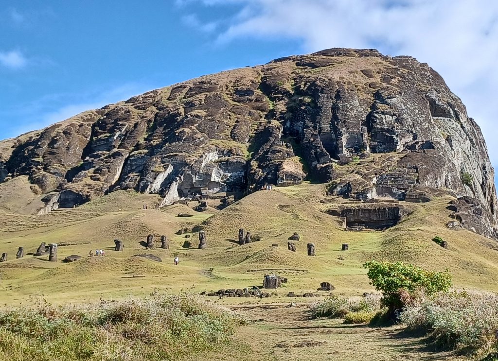 I am picked up by a young driver outside the wicket gate of my hotel, where I patiently await. Hop in the car, already holding two American passengers in its back seat. ‘Morning, morning’, and we head off to meet with the main transport, a minibus. The guide, who goes by the mercurial name of Yoyo, drives said minibus. I alight to greet him. Sporting shorts and flipflops and dark glasses, he has greyish hair tints and careworn lines on his face. Suitably welcomed, I get back in the car again, which appears to be the mode of transport for the other two and me for the tour’s duration, the minibus being full of other participants. Probably over booked. No matter. We head off eastwards to the major site of Rano Raraku. Splendid drive along the southern coast road. Breathe in the fresh Pacific breeze.