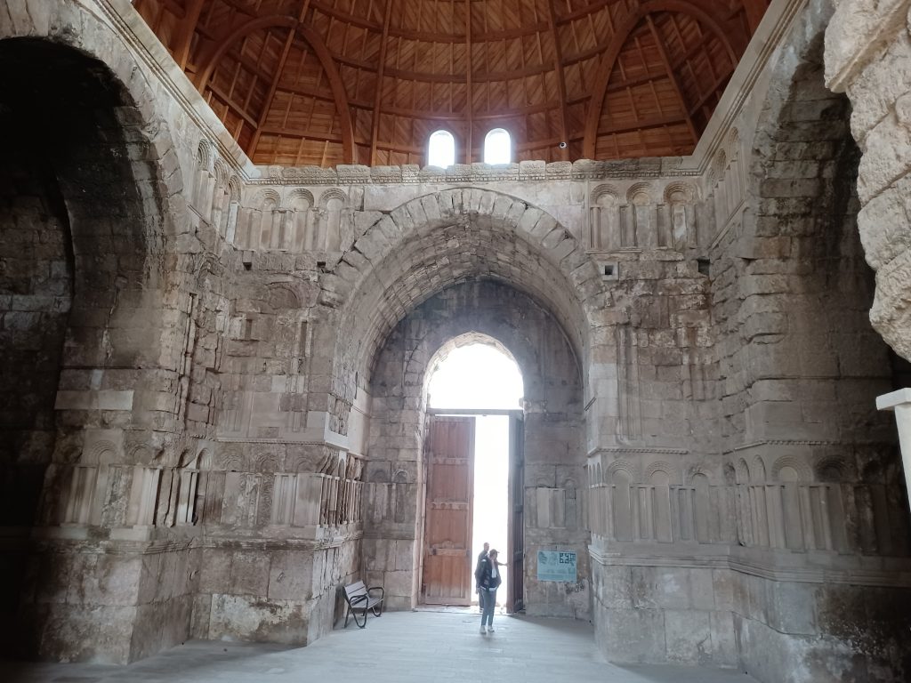 From the temple we look down on the Roman theatre, now surrounded by pale yellow and cream coloured modern blocks, residences of some of the four million inhabitants of modern Amman. The other main site on the citadel is the palace built by the Umayyads in about 720 AD. This was built over a Byzantine church and so its entrance hall is in the shape of a cross. We go in. A high impressive domed roof (restored) greets us, and a courtyard in front with stumps of columns. The building was destroyed by an earthquake in 749 AD, which also did for other cities at that time, such as Roman Gerasa.