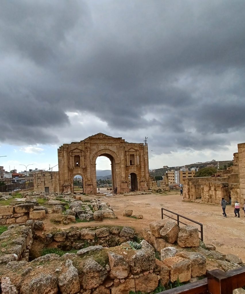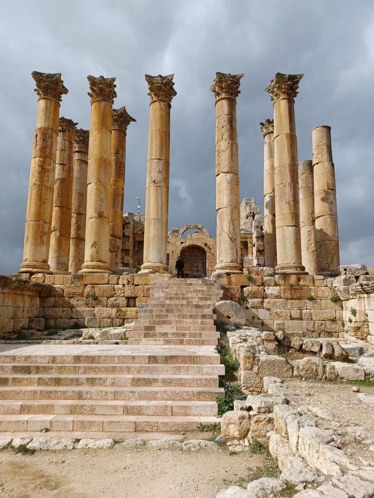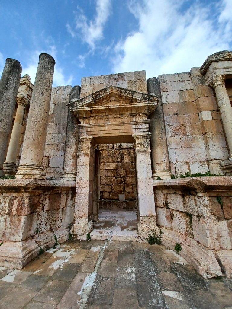 There are remains of bleached pediments, many with flowers and patterns carved onto them, columns and walls scattered everywhere in Jerash amidst the puddles. As I wander through the ruins of the yellowish brown stone temple of Artemis, patron goddess of the city, I meet a Columbian tourist. Said Columbian has a very large camera. We chat. He is very enthusiastic about the ruins and it appears that he has several days to explore them. “I will go to Petra another time, maybe next year,” he says, as he has not enough time on this visit. In contrast, we are scheduled to travel to Petra later today and view this famous city in the space of a morning. Hmmm. There is a lot more to see here in Jerash and not much time left to see it, but I am cold. I head speedily toward the Jerash rest house and restaurant. The temple of Zeus towers above its open terrace upon which are placed blue, green and orange plastic chairs, but it is too cold to sit outside. I cradle my coffee cup in my hands and gradually warm up.