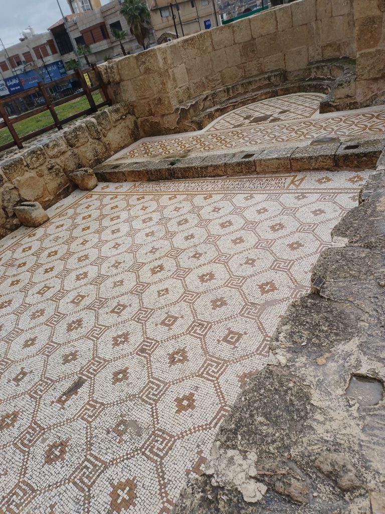 Our driver beckons and off we go, stopping briefly at the well preserved Roman theatre in front of which a guard sits yawning on the wall. A tour group takes some group photos, while others take quick selfies in front of it before leaving. It is cold. We head for a large touristy shop where some female artisans are making tiles with mosaic patterns of pomegranates on them. The pomegranate ‒ a symbol of fertility apparently ‒ makes up about 10 % of all crops here in Jordan, I am told, and grows well in dry areas, which is just as well as Jordan has a water shortage. No shortage of rain today, it has to be said.