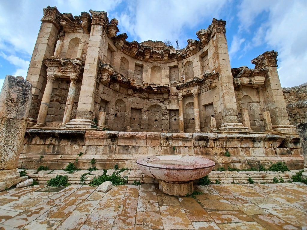 I resume my stride along the Cardo Maximus and reach the large well preserved oval shaped forum surrounded by columns with Ionic capitals. Ionic capitals are the ones with a kind of spiral or scroll decoration each side. From the forum the long straight street continues to the north gate. As I bumble along the massive slabs betwixt which are bits of greenery, I come to the Nymphaeum, a large ornamental fountain, which once supplied the water to the public. It is decorated with columns and capitals along with a couple of weathered lions’ heads, which would have spouted water. In front is a giant stone bowl made of pink granite. I touch it. It is smooth and cold.