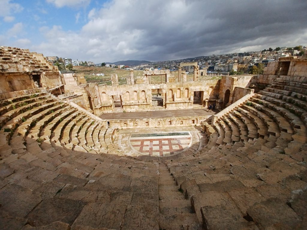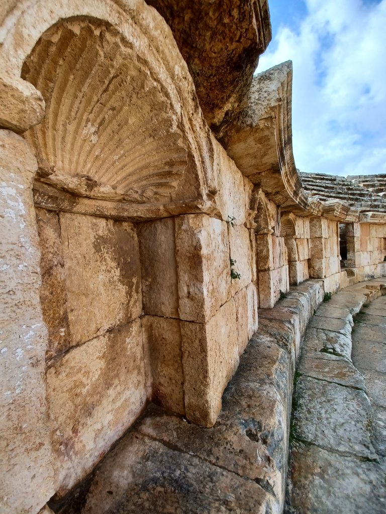 Up a slope near the north gate, the curved stone wall of the north theatre appears. I enter under an arched doorway to look down upon the semi-circular stage. Behind the rows of seats there are niches, which would have held statues. Scallop shells are carved into them. The signboard tells me the theatre was built in the second century but was abandoned, then occupied during the Umayyad period (661-750 AD) by potters. Like the rest of Jerash (and Amman) the theatre was ruined by the earthquake of 749 AD, but is now restored.