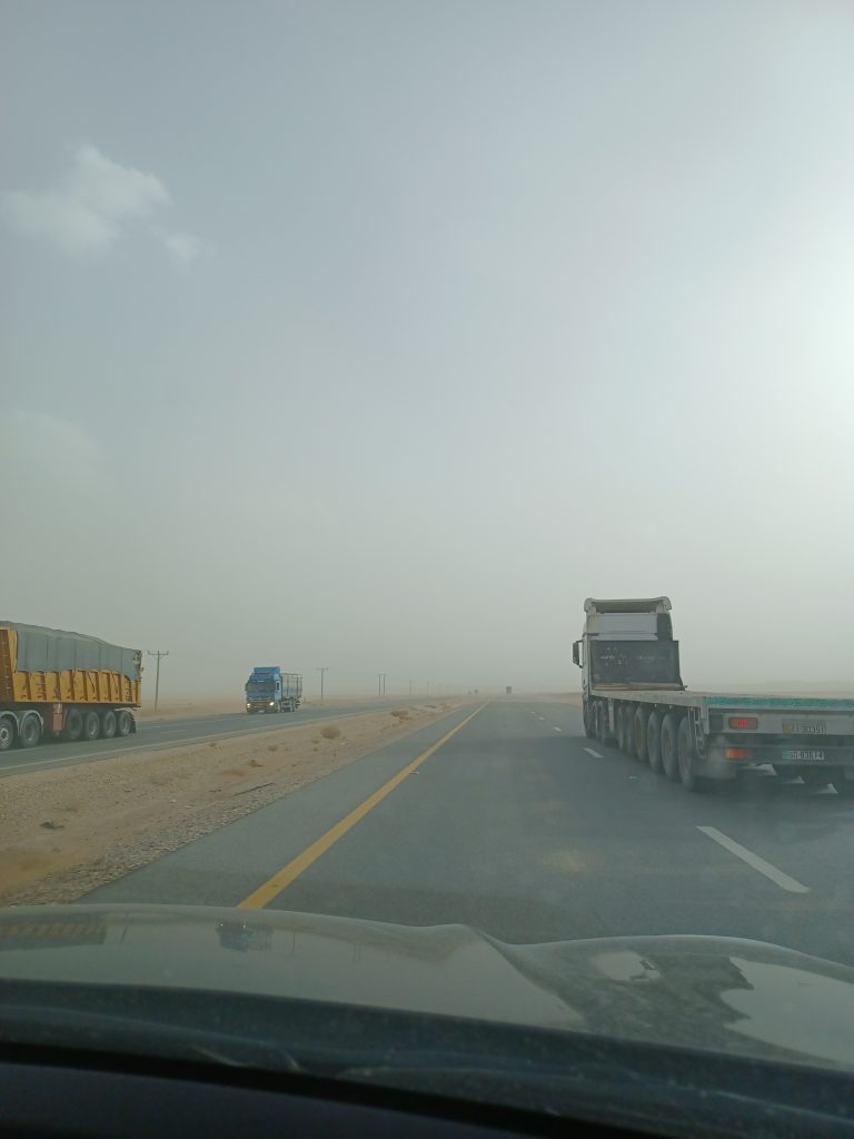 There are many trucks travelling this dual carriageway which leads south towards Aqaba and Saudi Arabia. It is a bit windswept and there is quite some sandstorm blowing, which reduces visibility. The windscreen wipers are on to try to clear the sand away. I am in the front seat peering ahead. “The road was closed last week,” our driver says. “Lot of sand”. “Not possible to pass”. One or two men are walking by the roadside, their bright scarves covering their heads and the wind buffeting their long robes. Rather them than me, I think. We pass many settlements of low houses, sand blowing everywhere. A stray dog stands mournful in a doorway.