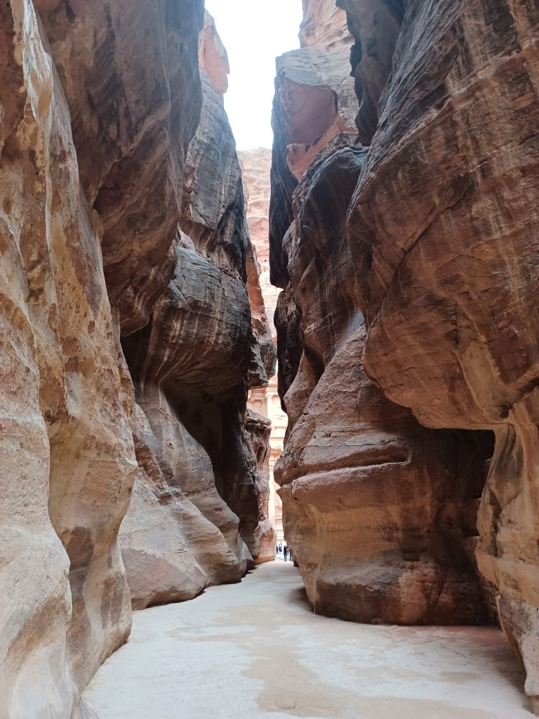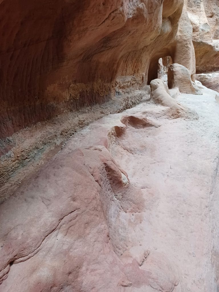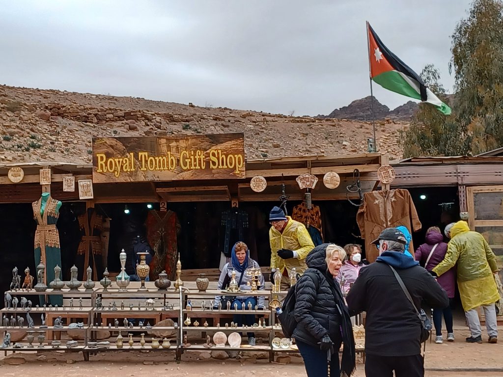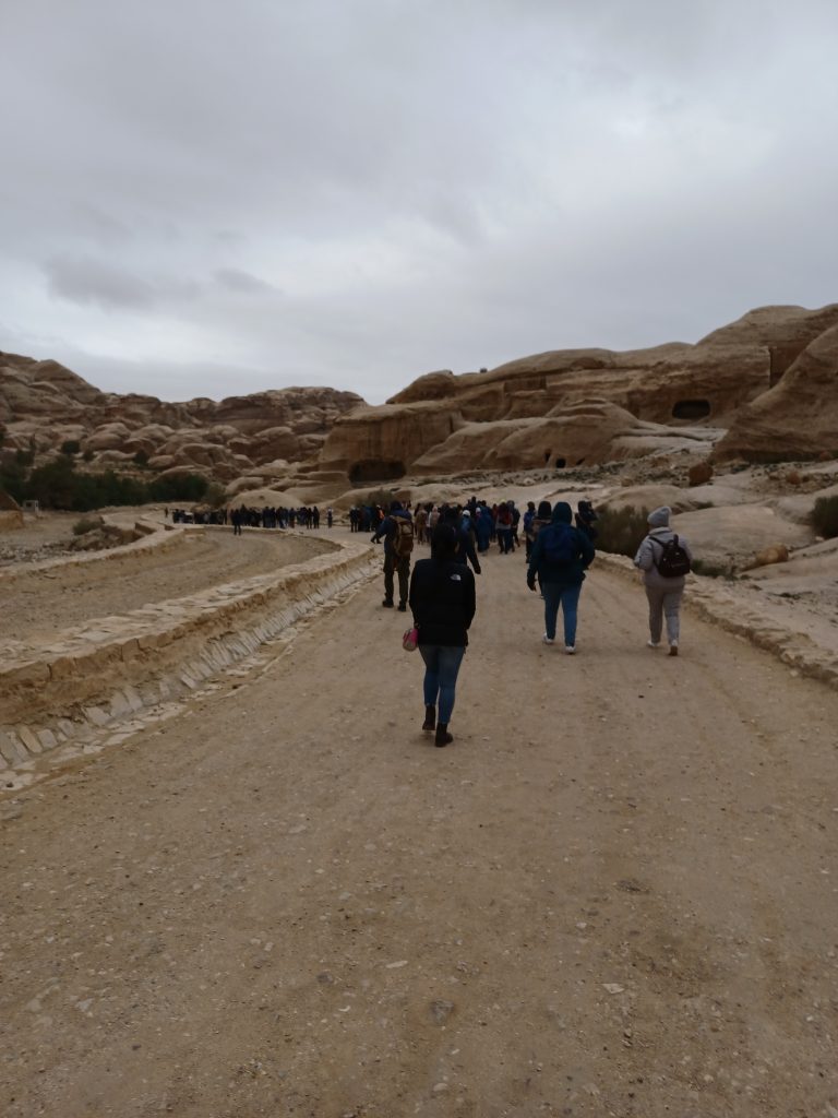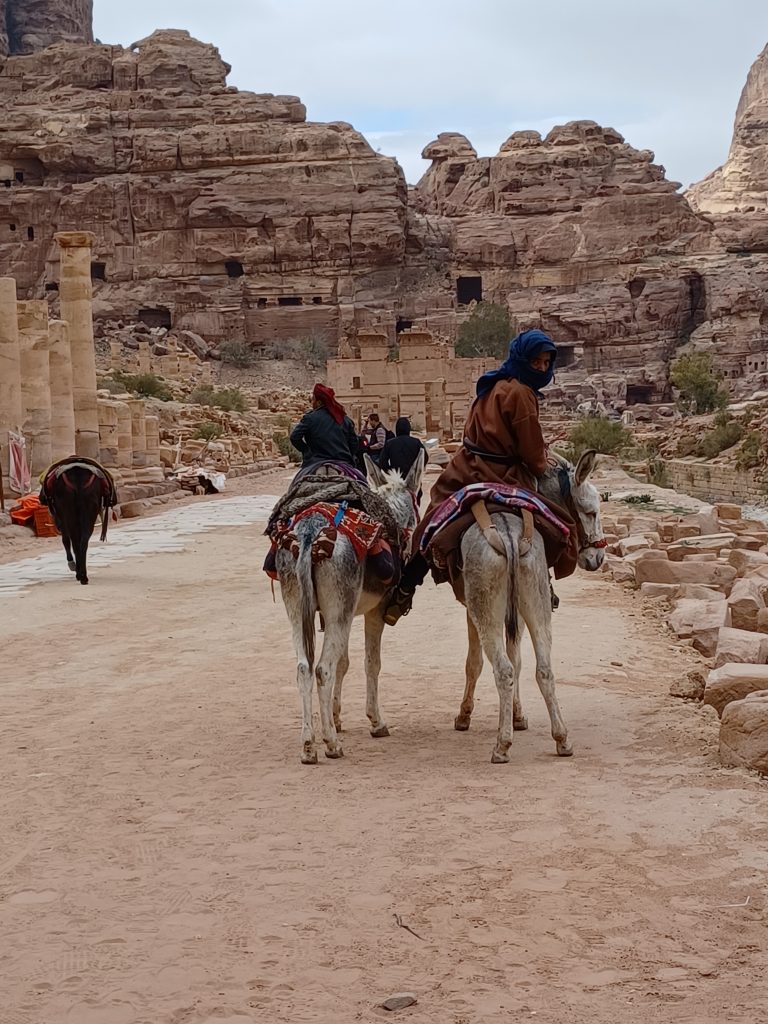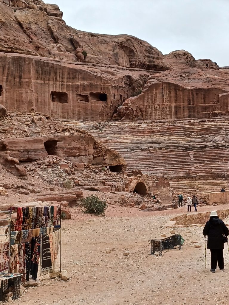 A local guide is provided. It is 0800. Our driver reminds us to be back at the gate by 1200. As we pass through the ticket office and souvenir shops, I spot racks full of gloves and other woollen items for sale to those tourists unprepared for the cold weather. I buy gloves. There is a biting wind as we follow our guide down the wide stony path. At least it is not raining. I had read that there was a flash flood here a few weeks before our visit. Despite the cold, there are quite a few tourists heading down the slope. I wonder what it is like in high season. It must be packed. Bedouin lie in wait with horses for hire to transport reluctant walkers. Nobody seems tempted. The horses’ saddles are draped with brightly coloured rugs.