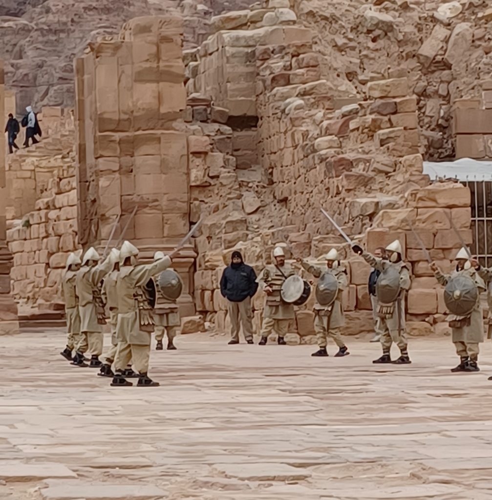 Further up the street, nine men dressed as soldiers from the Nabataean cohort of the Roman Army are marching in formation to a drum beat. Shouting orders, the commander marches ahead of two lines of four men wearing khaki with shiny helmets and ear pieces, shield, sword and sandals. They must have freezing feet. Afterwards, they chat to tourists and pose for photographs.