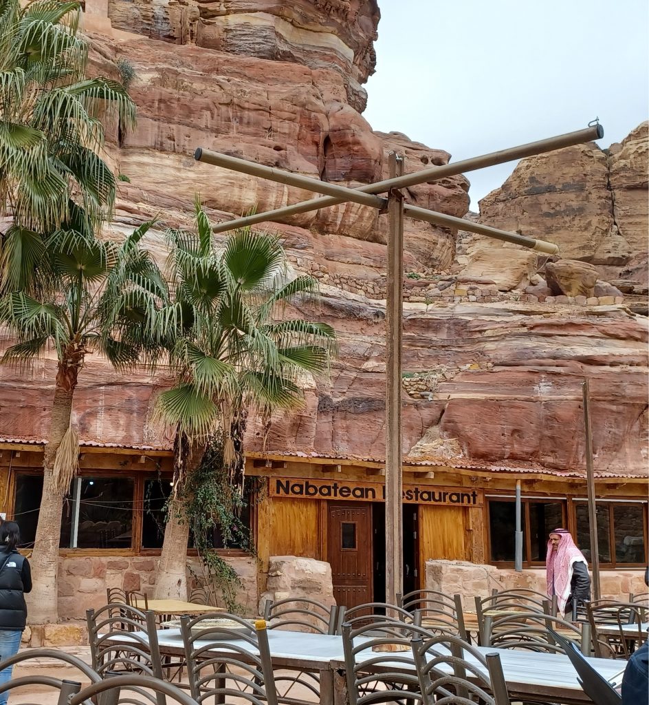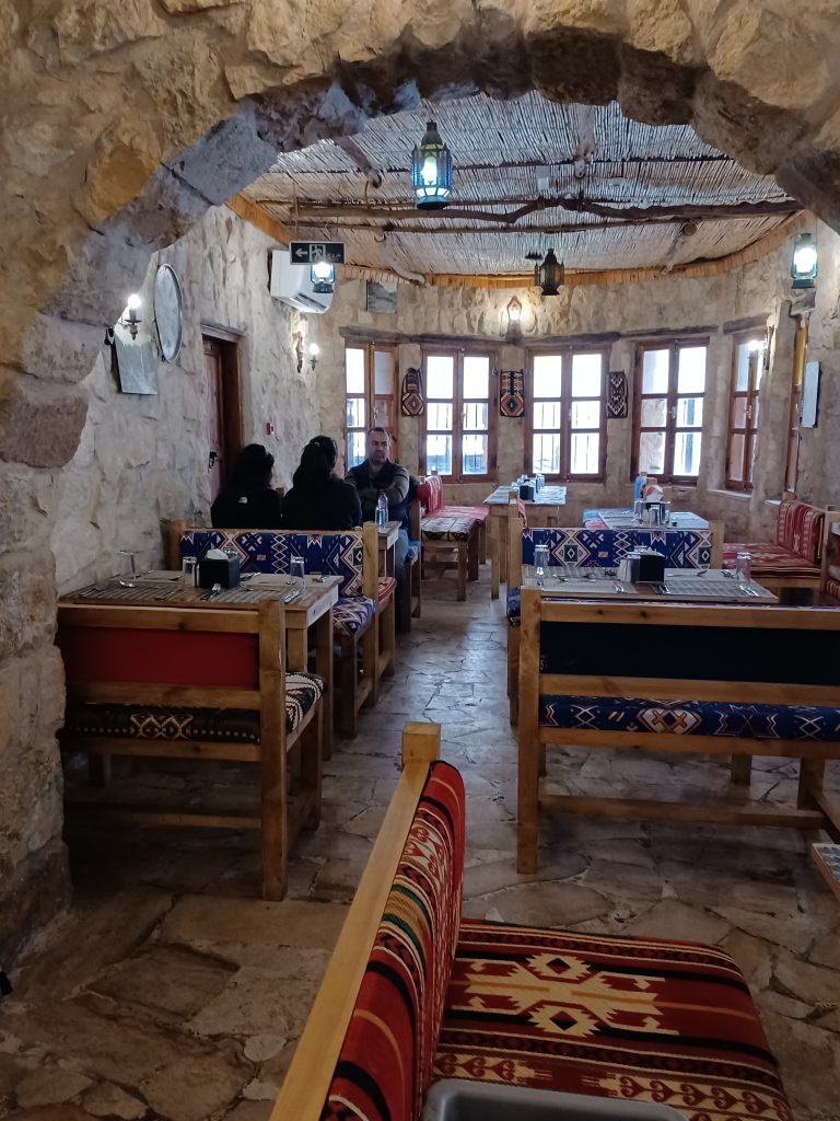 It takes a while to stride quickly up the siq. I ponder whether to hire a horse. I have broken a bone or two in the past through falling off them. Perhaps not then, but I could have done with a ride. Our driver hails me as, out of breath, I reach the exit. We lunch in a characterful restaurant in Wadi Musa. The walls and floor are stone, the wooden benches have colourful soft seats and it is warm. The buffet is stupendous, with heaps of meats, vegetables and salads, washed down with tea. A suitable ending to our chilly time in the ancient Nabataean capital.
