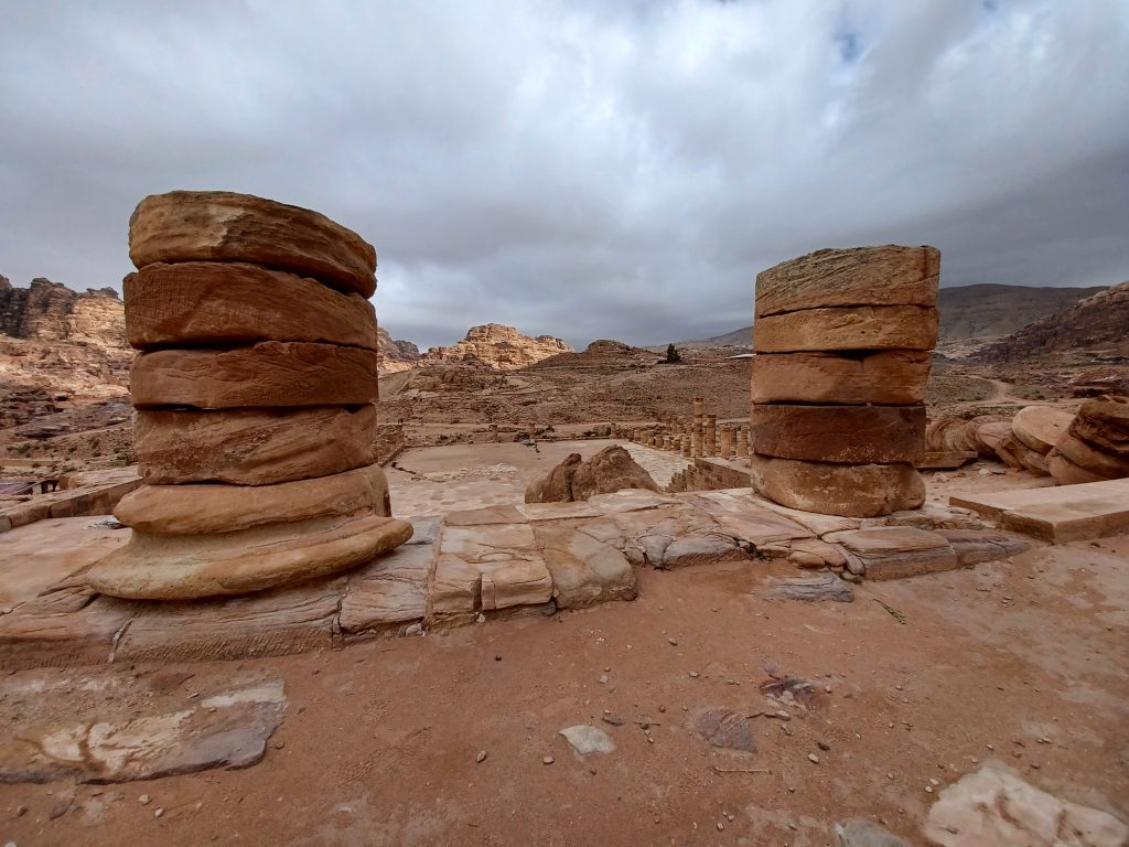 After coffee I ascend the ancient steps to the Great Temple, which is a mass of ruins. It is being restored by Brown University, USA, whose archaeologists began excavating here in 1993. Scattered over the site are many cylindrical shaped stones. They look like mill wheels. Some of them seem to have been reassembled into columns. Hexagonal paving slabs of sandstone in pinks and whites cover a part of the floor, which has columns all around it. The temple is the largest free-standing building so far excavated and would have been nineteen metres high, according to the signpost, thus towering above the colonnaded street. Most of the other buildings in Petra are cut from the rock. The once splendid houses and gardens, thought to have been here, would have been destroyed in the earthquakes.