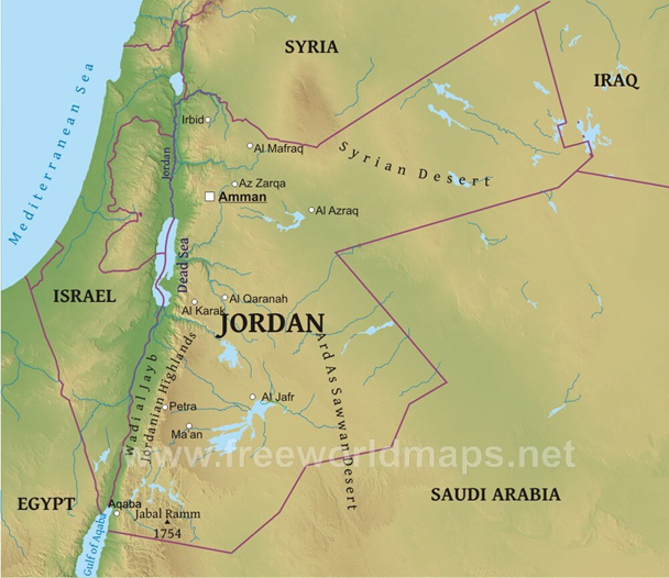 Jordan. The name has connotations. To some it means the Holy sites, for example, the River Jordan where Jesus was baptised by John the Baptist, and Mount Nebo from where Moses saw the Promised Land. To others it conjures up images of the rock cut tombs of the Rose City of Petra, built by the Nabataeans. Yet others have visions of Lawrence of Arabia in Arab dress, astride his camel, riding across the deserts in his quest to help the Arabs during the Arab revolt against the Turks during WWI. The Romans left their mark here, especially their city of Gerasa (present day Jerash); the Crusaders built forts, and the Umayyads built hunting lodges. In short, Jordan is a country with plenty of historical sites to see.