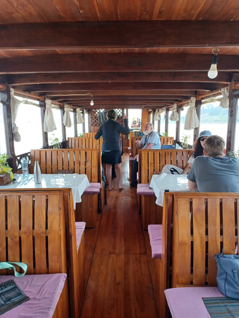 The Mekong river flows north-south through Laos, beginning its journey in China, into Burma, Laos, Thailand, Cambodia and Vietnam, and finishing up in the Mekong Delta in Vietnam. ‘Mekong’ or ‘Mae Nam Khong’ means Big River Khong. ‘Nam’; means river in Lao and the river forms over half of the border between Thailand and Laos. The broad brown Mekong runs swiftly through the hills and here we board our boat, our home for the next two days, but not nights. Sublime.