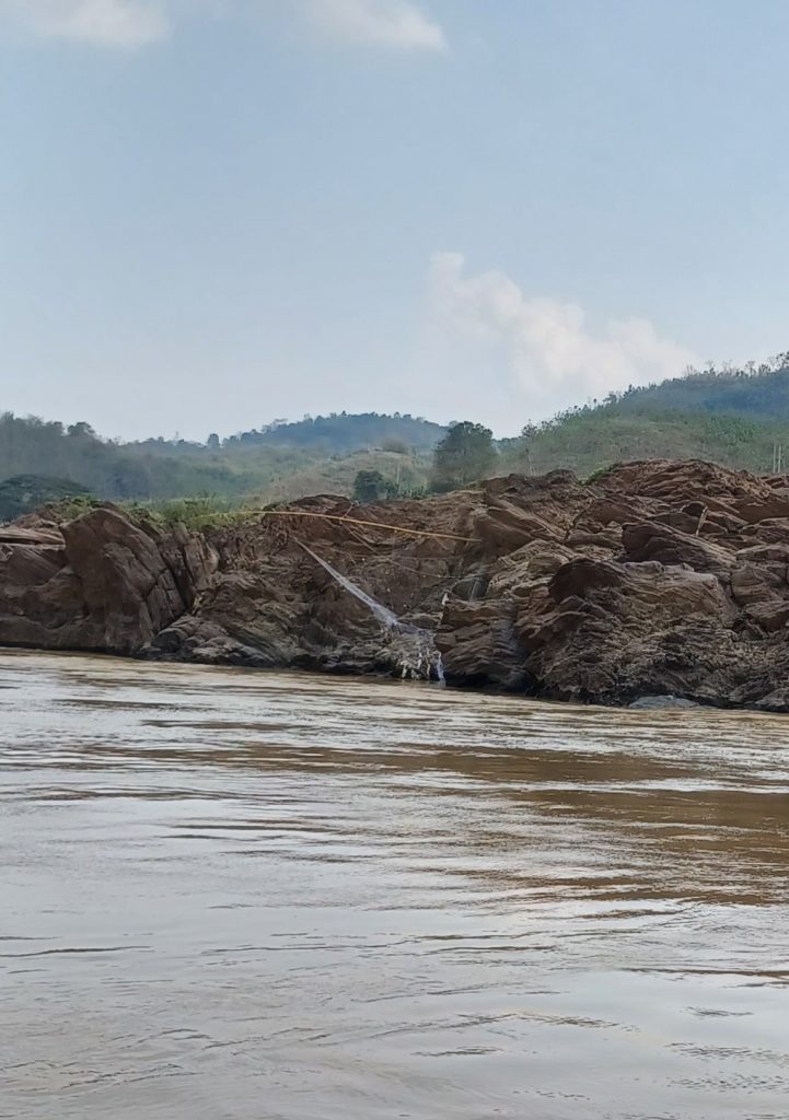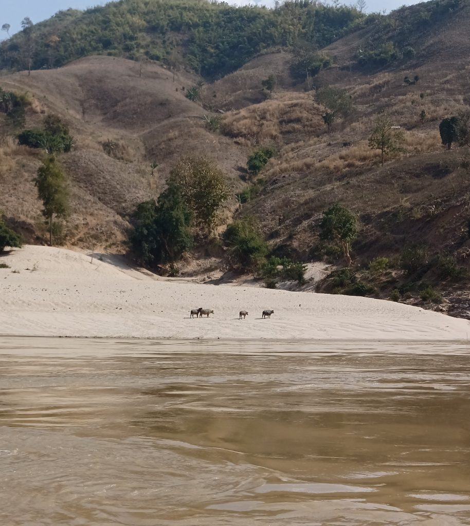 Cast off and off we go. Fishing lines on bamboo poles poke out from the rocks, panners are panning for gold. We shoot through narrow straits between the rocks, the captain steering between them with some skill. Good job. Not sure if there are life jackets on board or other safety features. Don’t let such thoughts bother me. Forest covered slopes, oxen on beaches, footsteps on the sand come and go. And a lone elephant. I scour the banks with my binoculars. Not many birds to be seen. Only the odd egret and a brown heron so far.
