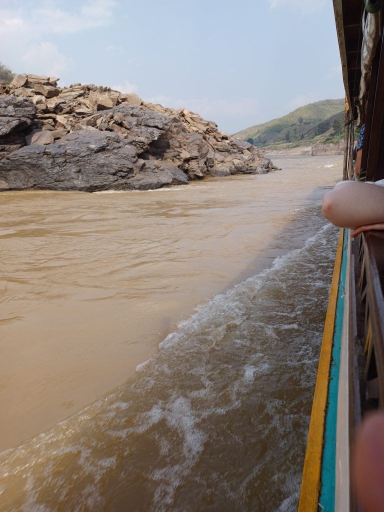 Swirling eddies all along and a very strong current. Reckon we could be travelling at ten knots with the current. It must take some power to motor in the opposite direction, i.e. upstream, I muse. There are no really large boats. It would be difficult for them to navigate the narrow passes. We are told that the water level is much lower than it should be and the guide points to the usual water line, seen on the rocks, which is two metres higher up. “The Chinese are building a dam upstream” he says, “and this is affecting the water level”. I was told this when exploring the Mekong delta in Vietnam ten years or so ago. Maybe this is another dam.
