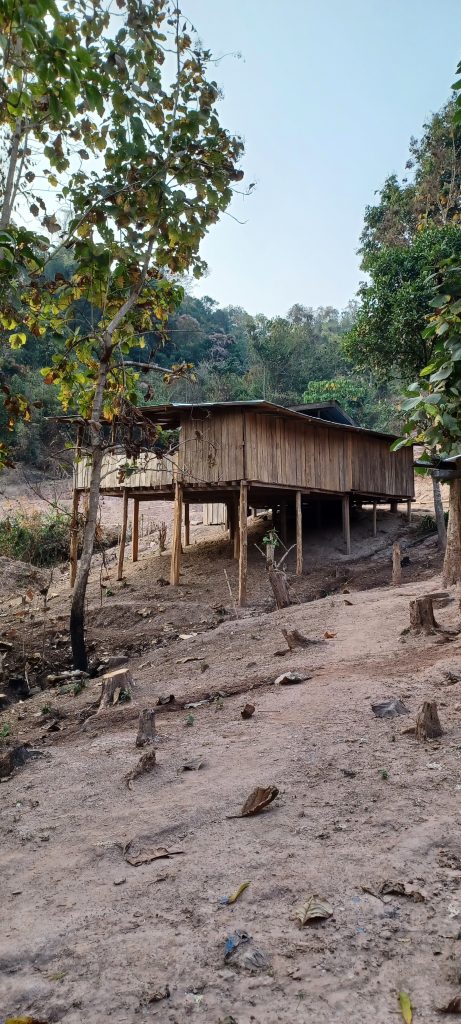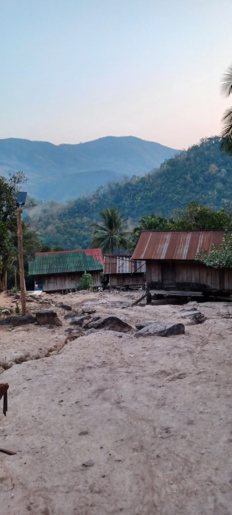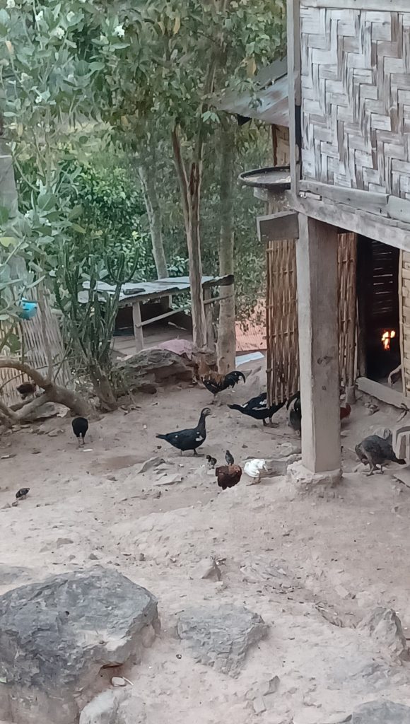 Entertainment over, we depart up the slope shining our phone torches en route to our various houses. I take advantage of the outside toilet before entering my abode. Then take off shoes, as is usual practice, and climb steepish wooden stairs to find my ‘bed’, a thin mattress on a rattan mat with one blanket protected by a mosquito net. Four identical beds lie side by side. Not exactly 5 star. Bare light bulbs are strung on worn wires and attached by crocodile clips to the ceiling of the accommodation. Don’t sleep well. Possibly because I have to venture outside to the tempting toilet and I wait far too long before finally forcing myself to get out to answer this call of nature. I had drunk a lot of water, as one should.
