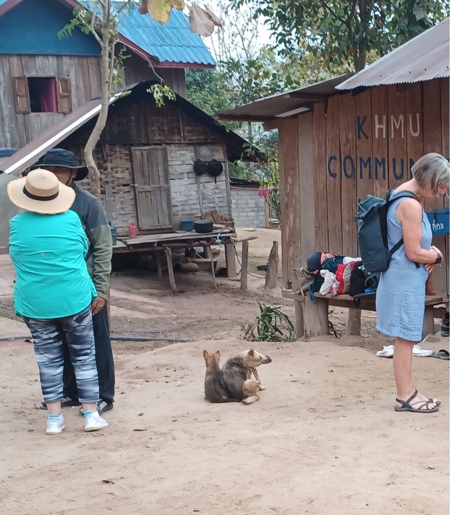 After breakfast we assemble outside the community hut, thank our hosts and their dogs and head down the leafy track towards the Mekong. And the mist hangs over the forest and our river boat awaits us in the stream.