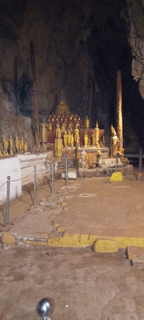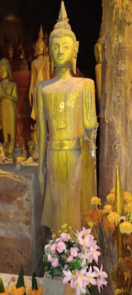 Sufficiently energetic, I ascend to the upper caves 278 steps up. These caves were first used for religious purposes when the people worshipped ‘Phi’ or the spirits of nature, according to a notice. Buddhism spread much later and in the 16th century the kings of Laos adopted Buddhism. The King apparently, up until 1973, used to make a pilgrimage to the caves for the New Year.