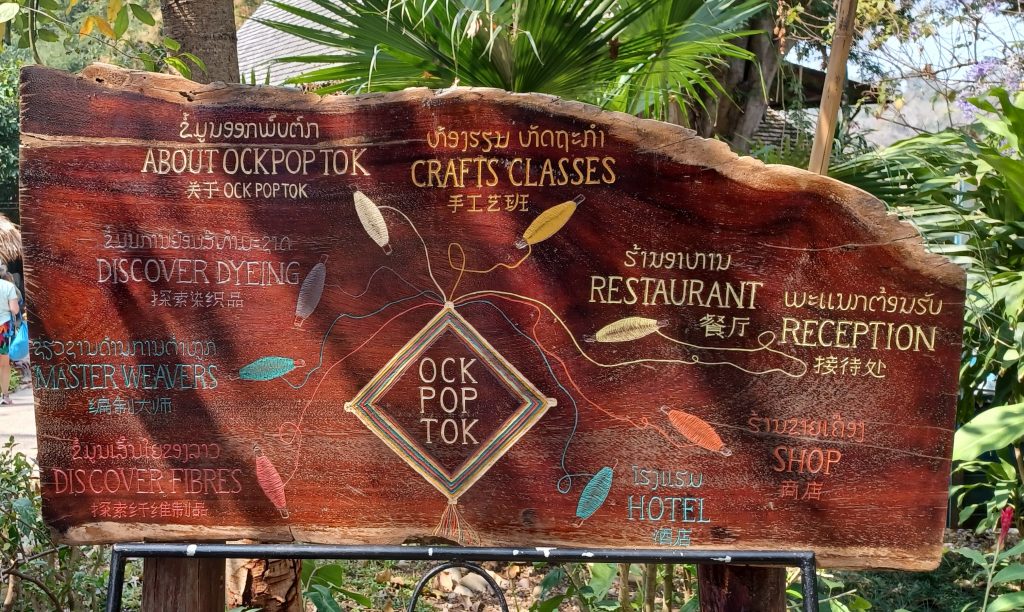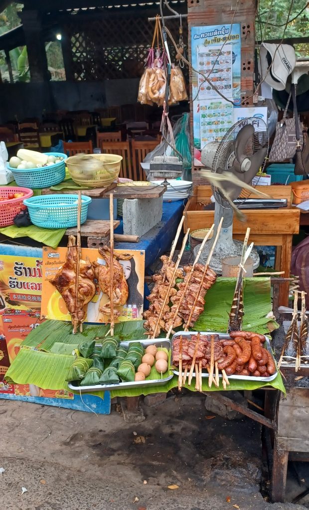 Amble along to read some info about bamboo. A flexible plant this is with a tensile strength greater than steel. Who knew. Further information about hemp and how sustainable it is and better than anything else for carbon storage. OK. All very fascinating and brain enhancing. Amongst the foliage hangs a large map, which I peruse. This depicts the silk road trade route between east and west in 400 AD. And, of course, there is an enticing shop selling handicrafts. More alluring still a splendid café overlooking the Mekong, placid and unruffled. There to lounge a while before heading off to today’s highlight.