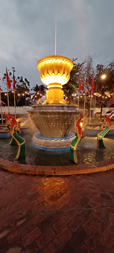 Alongside the night market is the splendid 18th century Wat Mai (New Monastery), glowing in the flood lights. A very important temple, I understand, and the largest in the city. Fountains twinkle, king cobras (known as nagas) – not live ones – guard temple entrances.