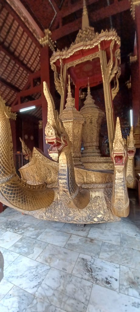 During my wanderings I enter the Carriage House containing relics of King Sisavang Vong, who died in 1959. The golden carriage within took the coffin to another temple, Wat That Luang, for cremation I understand. Pulled by seven golden nagas. More Buddha statues. I wander around the temple precincts for some time amongst the palm trees and bougainvillea, a boat house, and shrines.