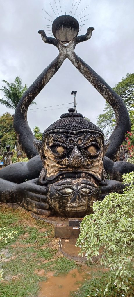 File back into the tuk-tuk lurking outside. “You mustn’t miss the Buddhas in the Park”, our CEO had advised us before we left. OK. We head thither. It transpiring that the Buddha Park is twenty five kilometres from the city centre, the overloaded tuk-tuk crawling and phutting its way with its soggy occupants, I begin to lose my sense of humour, as do most.
