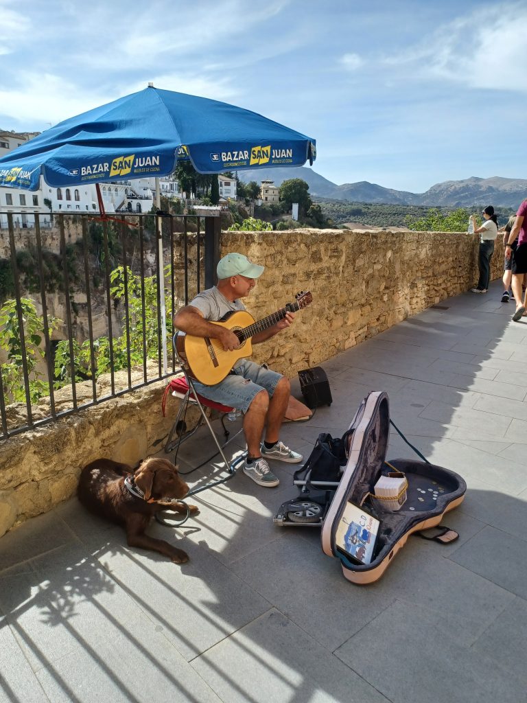 There are steps leading down into the gorge and I can see people hiking up and down them. A guitarist plays ‘Memories of the Alhambra’, on the pathway alongside the gorge, while his dog sits in the shade alongside. I buy one of his CDs, the guitarist’s I mean. He is very proficient. I like guitar music. Plenty of gift shops are open selling the usual Spanish paraphernalia, such as fans, ceramic bulls, tee-shirts and socks adorned with bulls or flamenco dancers, and fridge magnets.