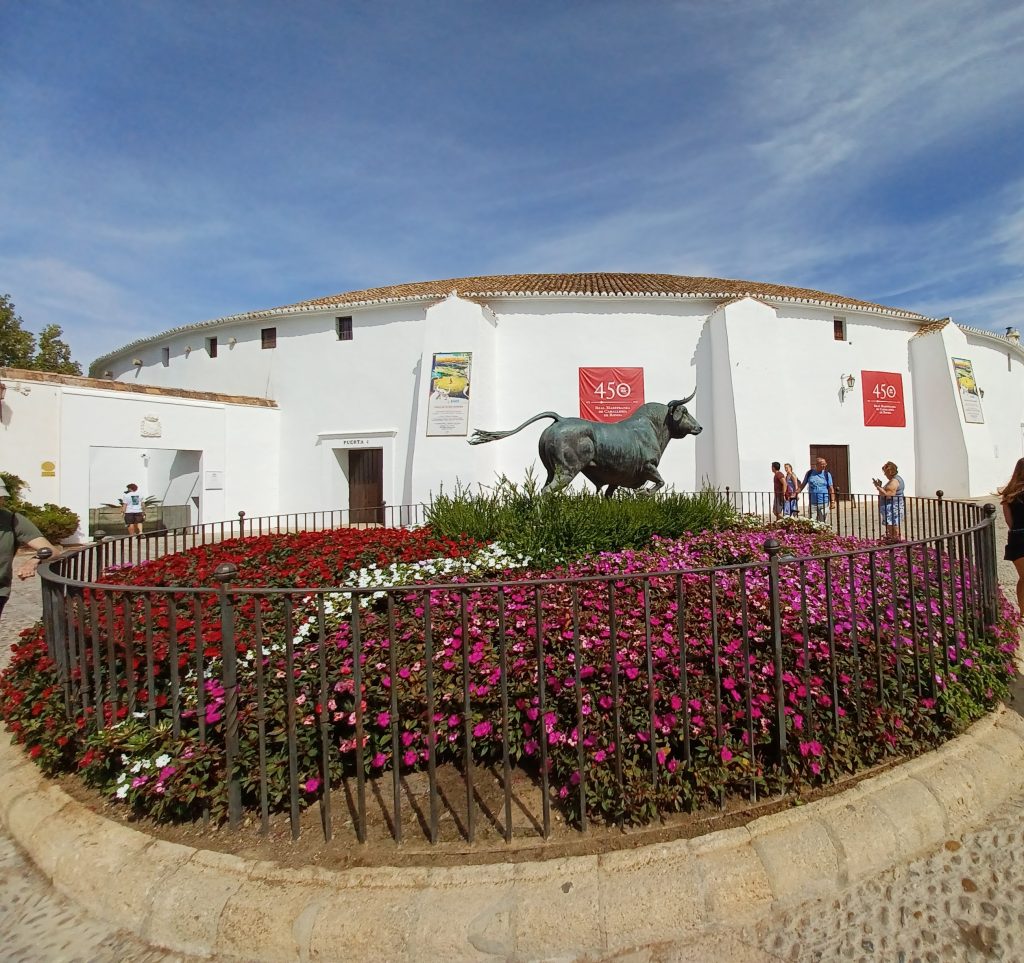 We are led from the disembarkation point through the town towards the tourist information centre. Opposite the tourist information office, in the Plaza de Toros de Ronda, is the Real Maestranza de Ronda, Ronda’s bullring, the first in the world to have been completed and one of the five best in Spain, we are told, along with those of Seville, Granada, Madrid and Salamanca. Built in 1785, it featured Pedro Romero as its first and most famous bullfighter. Located near the entrance to the bullring is a large bronze sculpture of a bull, head held high, tail flying, surrounded by purple and red flowers.