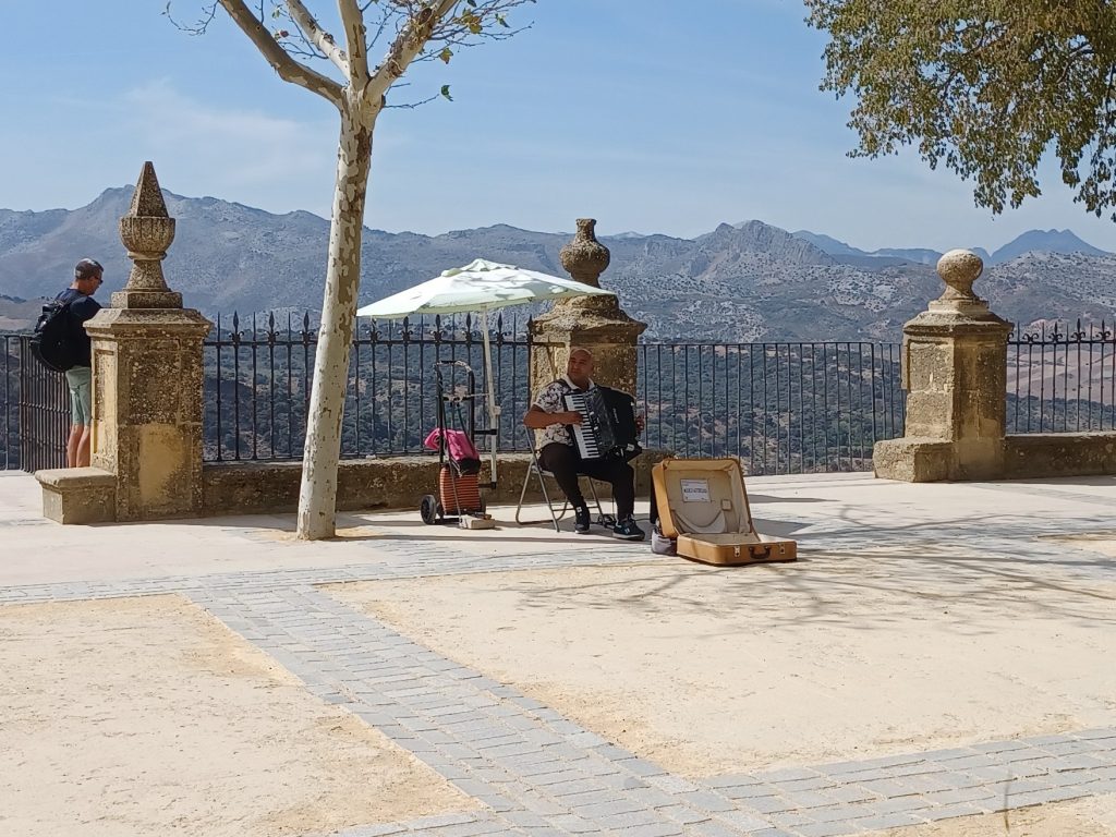 Heading back to the coach we pass through a shady square in which there is a statue of Pedro Romero standing erect on a stone plinth in the shade. Most visitors though seem more interested in the scenery and are gazing over the railings into the gorge below. An accordionist serenades onlookers there, his accordion case open in front of him to catch a hopeful euro. And then we depart Ronda.