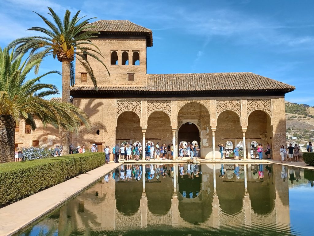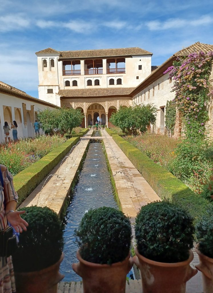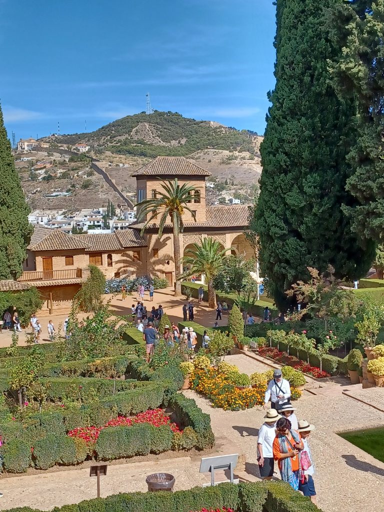 I visited the magnificent Moorish palace of the Alhambra eons ago and am looking forward to seeing it again, even though I feel like death warmed up and am coughing and spluttering into my mask. Much has been said about the Alhambra by our guide, how lucky we are to have acquired tickets etc etc. We wander round the gardens with the local guide. Exquisitely beautiful, the gardens are, with pomegranate trees (the reason for Granada being named Granada, I understand), flower borders, palm trees, and pools of water. Birds trill in the neat hedgerows. The only blot on the landscape is the stream of tourists endeavouring, perhaps, to capture the solace and tranquillity of this place.
