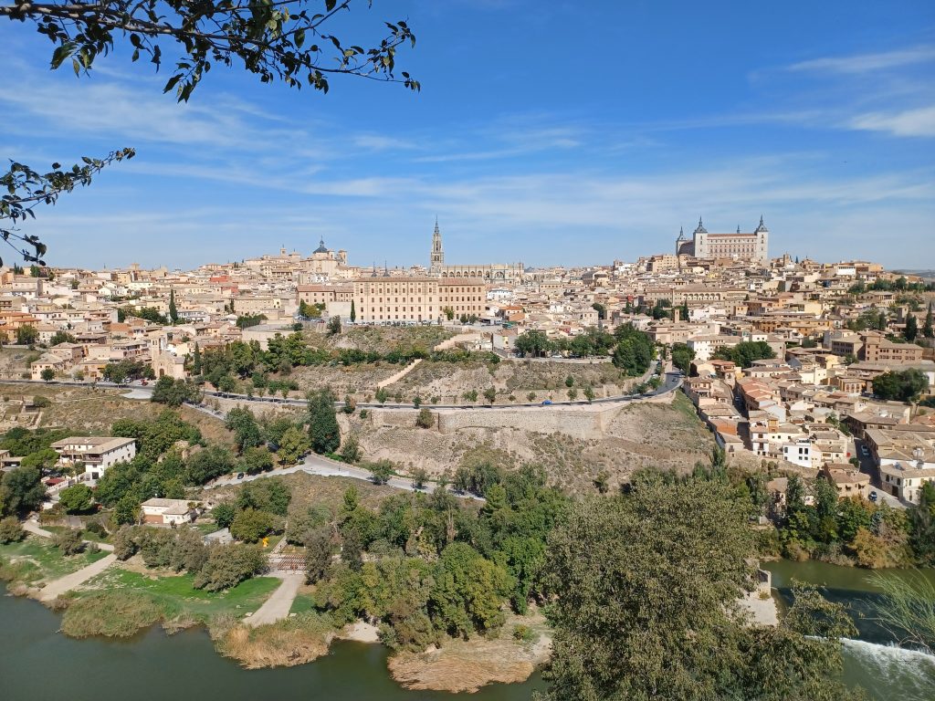 The final stop on the tour is Toledo, capital of the province of Castille – La Mancha, perched upon a rocky hilltop surrounded by a wall and, on three sides, by the Tagus river. Everyone piles out of the coach at a viewpoint to take pictures.