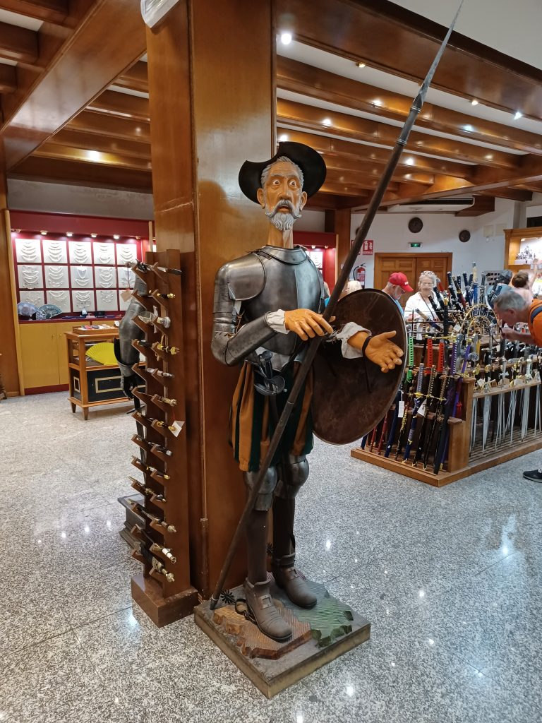 We do, however, have a splendid lunch in an establishment catering for large tour groups, overlooking Toledo from across the river. The Spanish like their lunches – and their dinners ‒ and provide unto visitors what they wish to be provided unto themselves. No complaints there. As we exit the restaurant via a small shop, we come face to face with Don Quixote standing against a wooden upright in his armour, with lance and shield. Tilting at tourists perhaps.