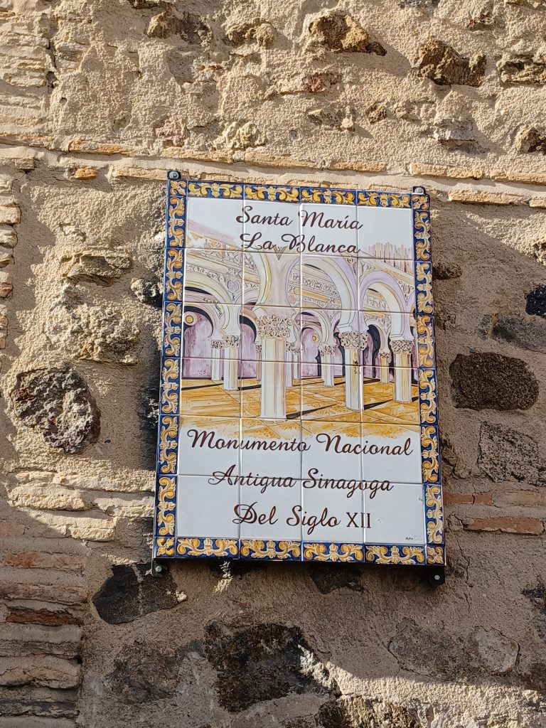 We have a whistle stop tour. The local guide, dapper sort of chap, who walks somewhat speedily, has already finished his spiel to those of the tour group that keep up with him. The stragglers, wishing to gaze awhile, miss out. No wonder tour groups take so many photos. They only ever get cursory impressions, no time to gaze at leisure, no time to take in the images seen, so photos provide the opportunity to digest it all at home. We pass the huge medieval Gothic cathedral built upon the previous mosque, but do not go in. We come to the synagogue but do go in. The oldest synagogue in Spain still standing, I understand, and dating from the 12th century, it was built by the Moors for the Jews and is full of Moorish designs but with Jewish motifs, such as the Star of David. It is delightful with its white columns and arches with gold painted capitals. It later became a church.