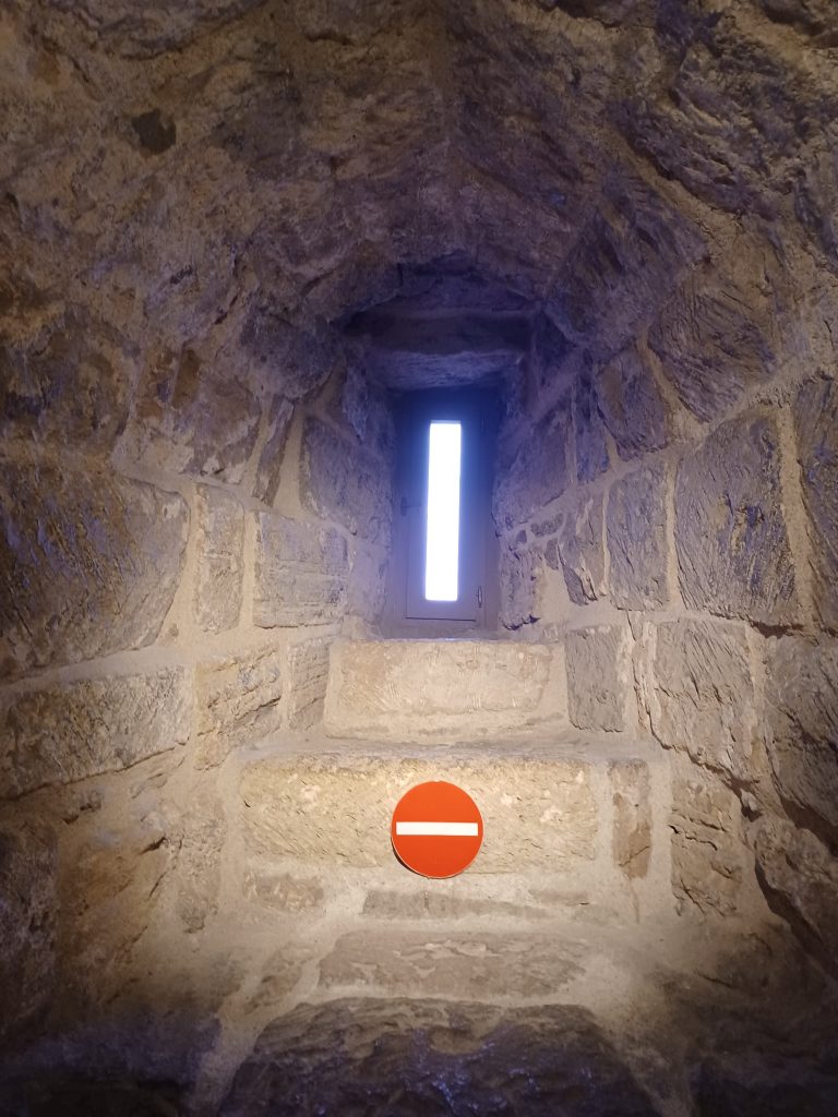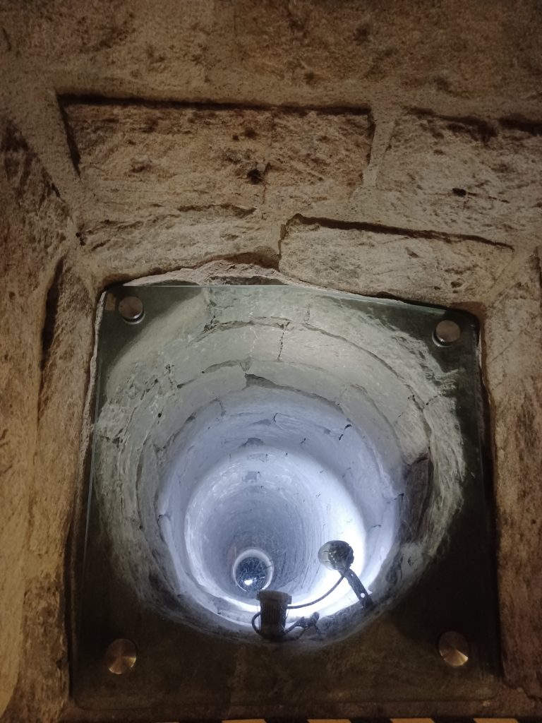 We enter the tower and clamber up stone spiral staircases, worn by countless feet, between floors. Maiden Tower originally had no steps to its first floor, thus preventing the enemy from pursuing the citizens sheltering within, our guide informs us. Said citizens would have been hoiked up by ropes to reach it. I note the massive walls, which are between three and five metres thick as I climb to the top. Exit onto the roof, around which are railings with glass sides, put there to ensure the clarity of the view but to prevent enthusiastic would-be jumpers off from jumping off. Inside the tower is a well, from which those cooped up inside, as many as two hundred, could procure fresh water.